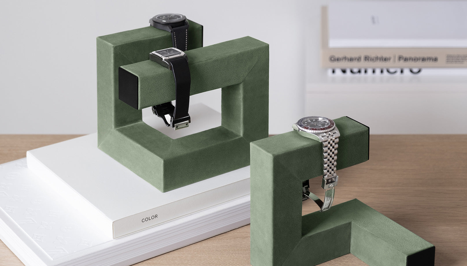 Featuring a solid aluminum body, the Hudson watch stands are covered in soft, one cut nubuck leather, making them durable and wear-resistant. The sculptural pieces are handcrafted specifically for everyday use with padded display areas to ensure that your watch will be resting comfortably, away from the harm that builds up from keeping a timepiece on hard surfaces. In addition, the Hudsons can be arranged in multiple positions for endless versatility, for instance as refined bookends or paperweights.