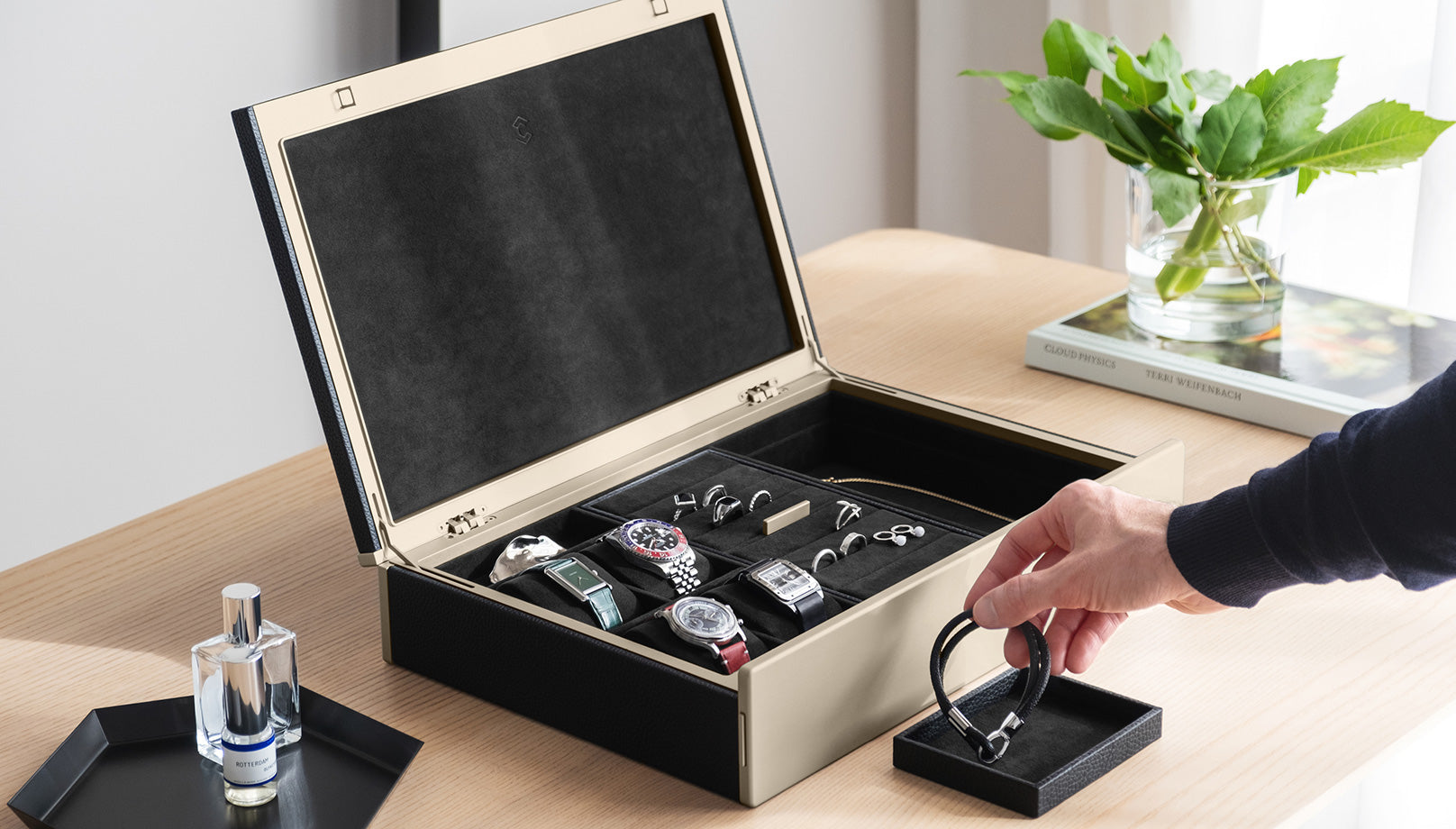 Fabriqués localement à partir de matériaux raffinés, les accessoires de cette collection offrent des solutions de rangement à la fois élégantes et durables. Des boîtes à montres à six fentes avec coussins souples, des boîtes à montres et à bijoux avec compartiments d'organisation amovibles et rembourrés, et des combinaisons de supports de montres en deux parties qui permettent diverses options d'agencement - la protection de vos garde-temps peut maintenant se faire d'une manière qui convient à votre style personnel.