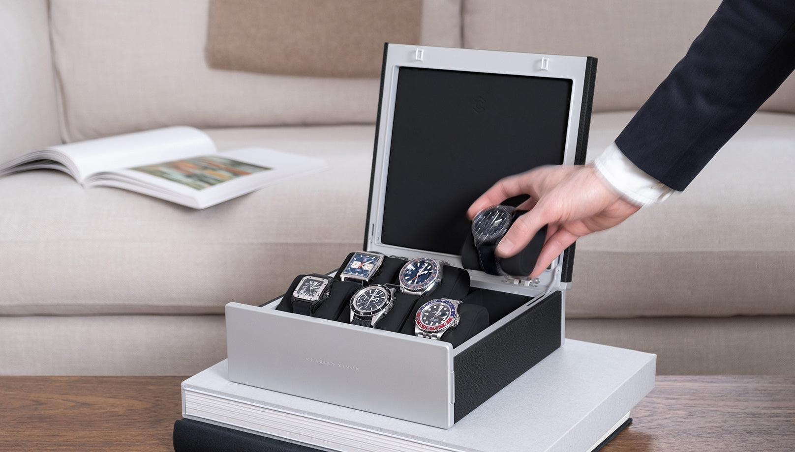 Un design impeccable et des matériaux raffinés s'associent pour incarner l'engagement de Charles Simon en faveur d'une qualité exceptionnelle. L'extérieur de le coffret à montres est habillé de cuir de jeune taureau, provenant d'une tannerie familiale du sud de la France. Un boîtier robuste mais léger en fibre de carbone et en aluminium anodisé assure la protection de votre collection de montres. L'intérieur ainsi que les coussins amovibles pour les montres sont recouverts d'Alcantara, un tissu semblable à du daim, disponible dans une large gamme de couleurs.