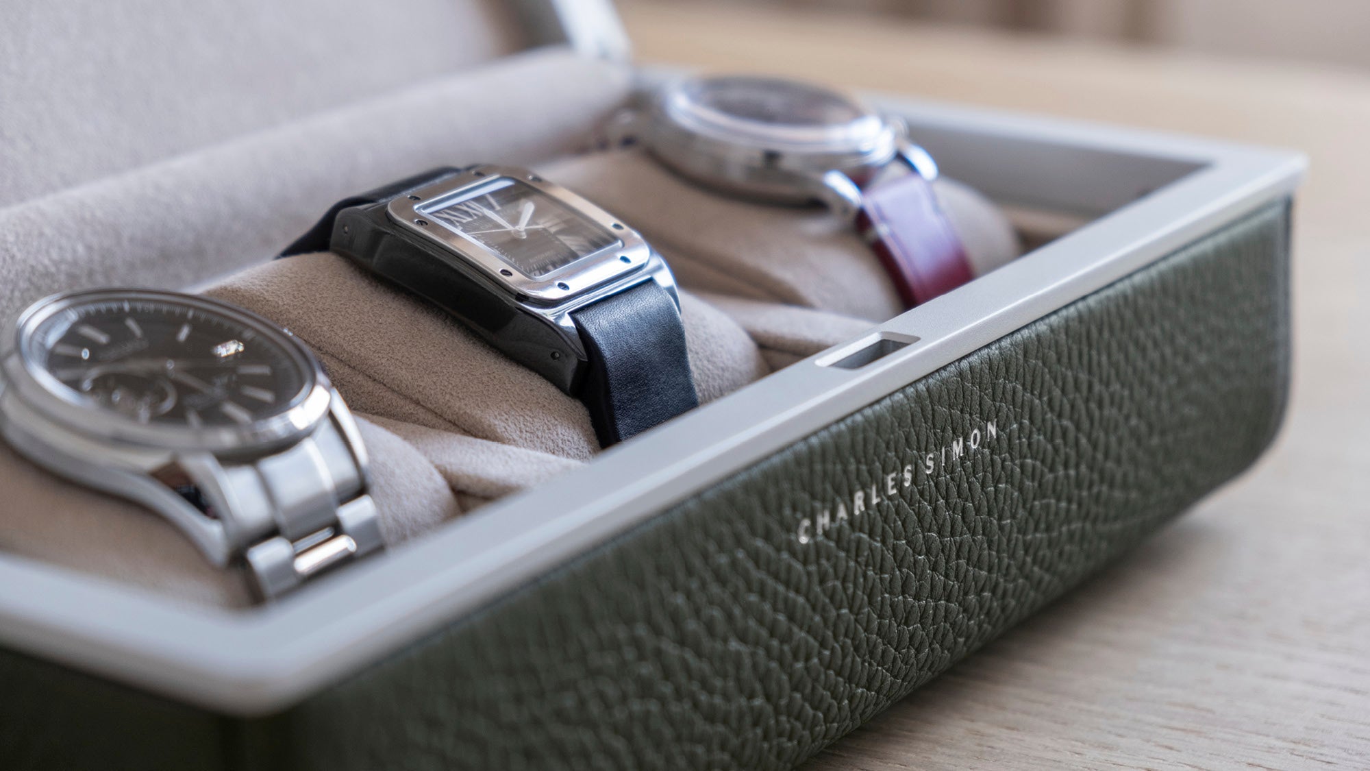 Protégez vos montres avec style grâce à l’étui Eaton 3. Minimaliste mais audacieux, cet étui semi-rigide en cuir de taurillon, est doté de trois coussins amovibles en Alcantara® et d’un fermoir en aluminium robuste. Il est le compagnon de voyage idéal pour protéger vos garde-temps préférés, mais peut également être utilisé comme présentoir pour les mettre en valeur avec élégance à la maison.