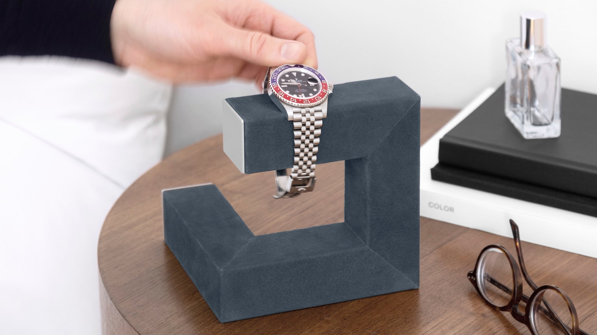 Customize your watch stand to perfectly complement your home and timepieces through our Personalization service. From bespoke nubuck leather colors, novel combinations with different shades of anodized aluminum and engravings on the aluminum plaque, there are endless ways to tailor this sculptural piece according to your personality and interior design style. A personalized watch stand will not only render your daily routine of putting on and taking off your watch extra special, it also is a statement piece that adds a touch of bespoke elegance to your home.