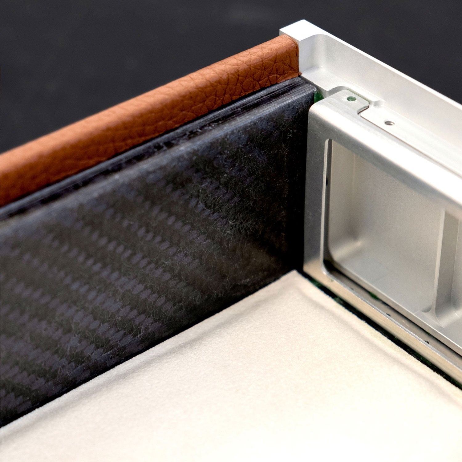 Hidden away from sight, the interior structures of our exquisite watch briefcases and boxes are fortified with carbon fiber plates to strengthen the accessories from within, ensuring maximum protection for the timepieces they hold. Despite their robustness, the carbon fiber plates remain incredibly lightweight, allowing for an effortless carrying experience without compromising on security.