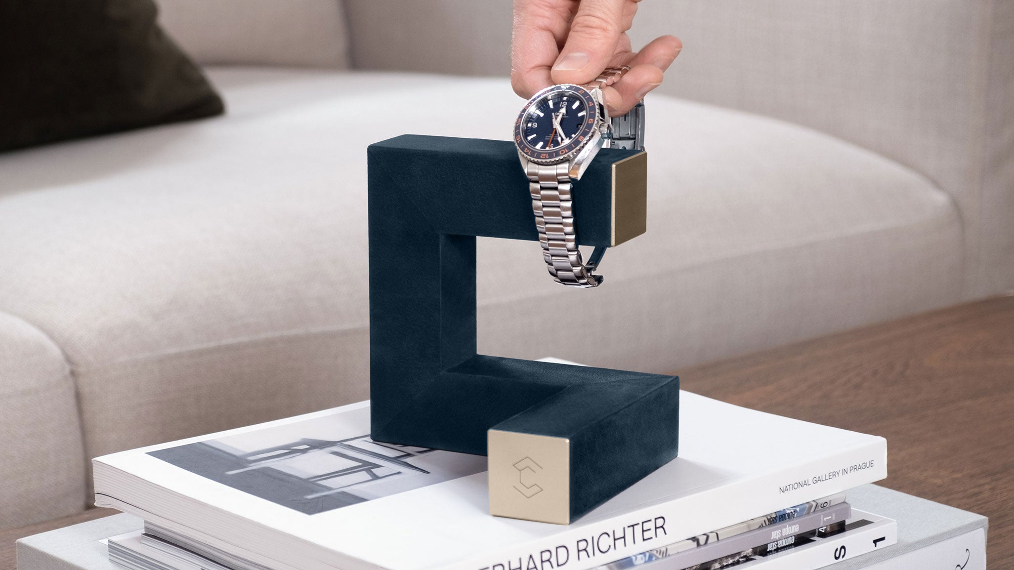 The Hudson 1 Watch stand in navy-teal and gold artfully displays your favorite watch in your home. This minimalist watch display allows you to save time when putting on and taking off your timepiece every day. Padded display areas optimize comfort and protect your watch from the harm that builds up from putting it on hard surfaces over time. The Hudson 1 features plates in a sophisticated shade of gold and is made from solid aluminum that has been covered in one cut soft nubuck by hand.