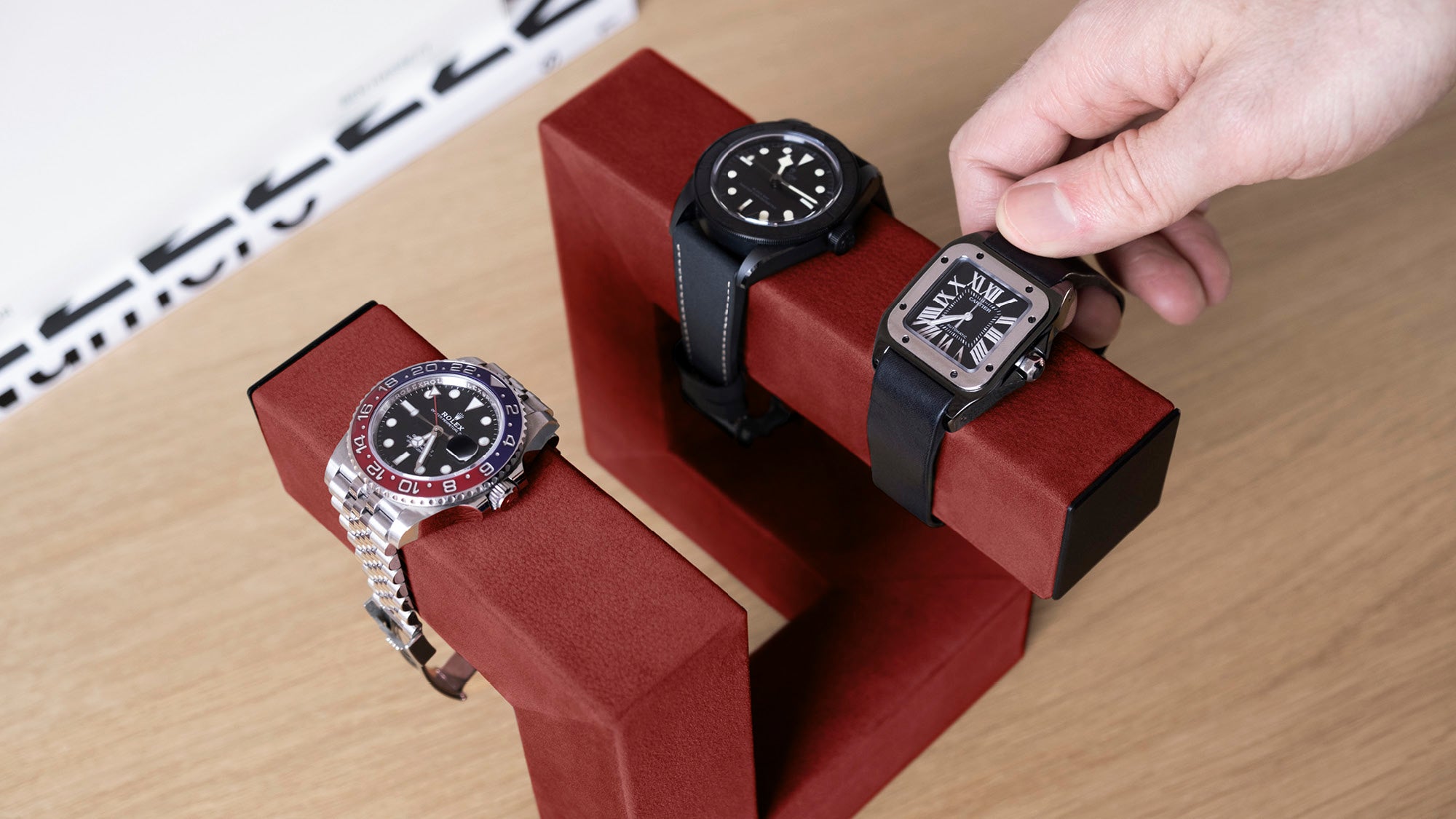 The Hudson 3 Watch stand elegantly displays your favorite watches at home. The sleek watch stand holds up to three timepieces and provides convenient access when putting them on and taking them off. Padded display areas optimize comfort and protect your watches from the harm that builds up from putting them on hard surfaces. The Hudson 3 is made from solid aluminum that has been covered in soft nubuck one cut leather by hand. The sophisticated watch display can be arranged in various positions to add a minimalist touch to any home interior.