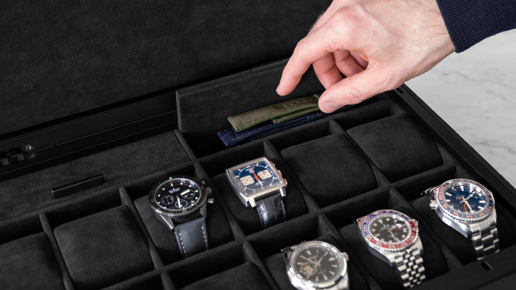 The Spence 12 Watch box in black leather elegantly stores and displays a watch collection of up to 12 timepieces. Handcrafted in Canada, the watch box exhibits Charles Simon’s signature minimalist design. Premium materials like aluminum and carbon fiber protective casing, French young bull leather and Alcantara interior lining make Spence the refined way of keeping your entire watch collection safe at home.