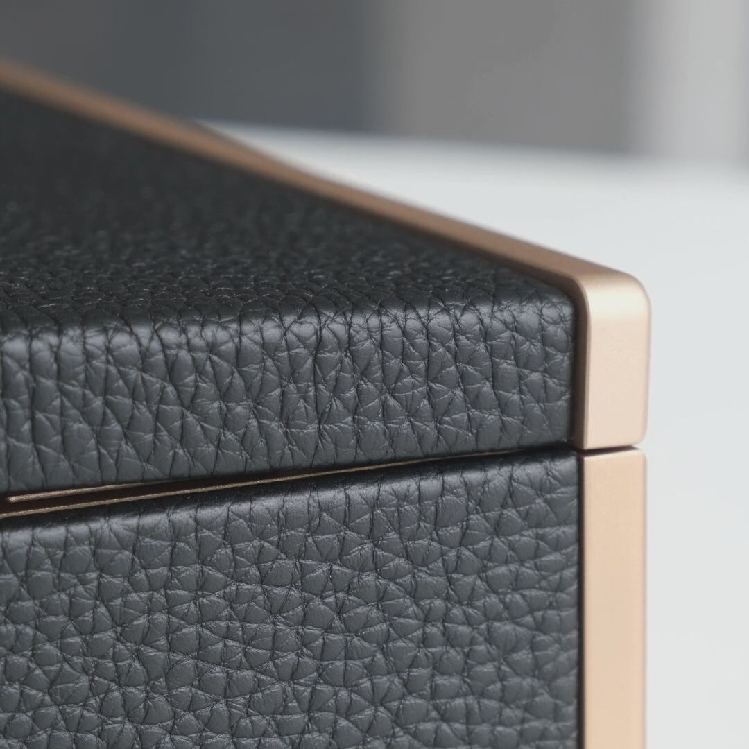 Elevate your watch and jewelry organization with the Taylor 4 Watch and Jewelry box from Charles Simon. This sophisticated box combines black, French leather, carbon fiber and gold champagne anodized aluminum for a refined look and feel. With room for four watches and well-organized compartments for rings, necklaces, bracelets and earrings, this elegant accessory keeps your precious collection in perfect order while adding a touch of luxury to your home.